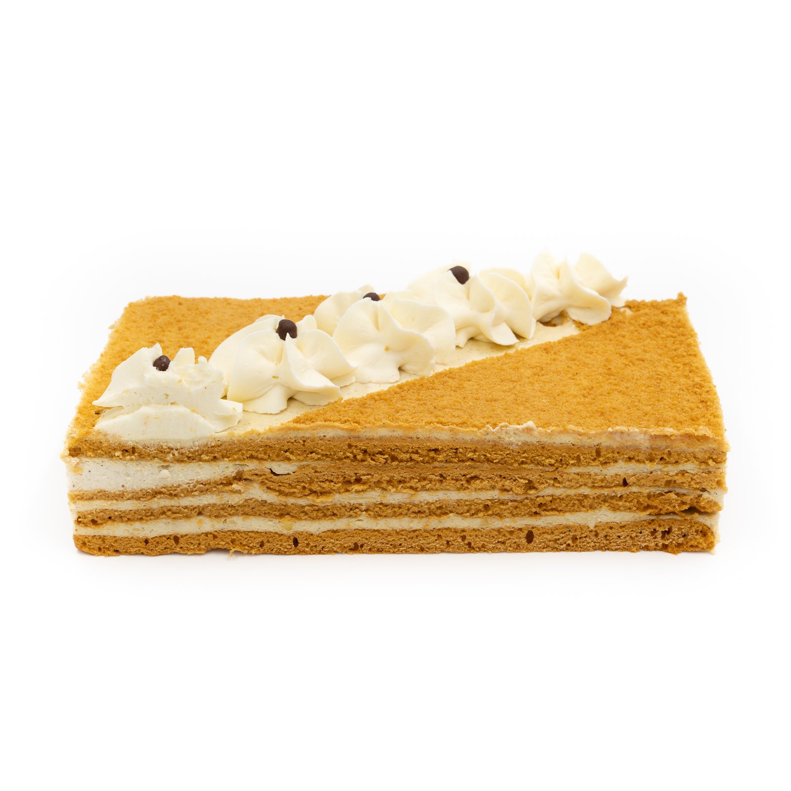 Auksinės meduolinės plokštelės sluoksnis po sluoksnio slepia švelnų grietinėlės kremą – klasikinis „Medutis“, kurio skonis sugrąžina į vaikystę. Lengvai karamelizuotas medaus aromatas ir burnoje tirpstantis kremas sukuria tobulą balansą tarp saldumo ir švelnumo. Tai desertas, kuris neperkrauna – jis ramina, vilioja ir džiugina kiekvieną kąsnį.
