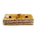 Cukrus, braškės, KIAUŠINIŲ baltymai, kreminis sūris (VARŠKĖ, nugriebto PIENO milteliai, natūrali kvapioji medžiaga, druska, tirštikliai: saldžiųjų ceratonijų derva, pupenių derva, rūgštingumą reguliuojanti medžiaga citrinų rūgštis), PISTACIJŲ RIEŠUTAI, MIGDOLŲ MILTAI, GRIETINĖLĖ, maskarponės sūris (pasterizuota GRIETINĖLĖ, pasterizuotas PIENAS, rūgštingumą reguliuojanti medžiaga citrinų rūgštis), KVIETINIAI miltai, baltas šokoladas 29% (cukrus, kakavos sviestas, nenugriebto PIENO milteliai, emulsiklis lecitinas, natūrali kvapnioji medžiaga), vanduo, PISTACIJŲ pasta, želatina, vaisių pektinas (E440, E450i, dekstrozė), citrinos sultys.