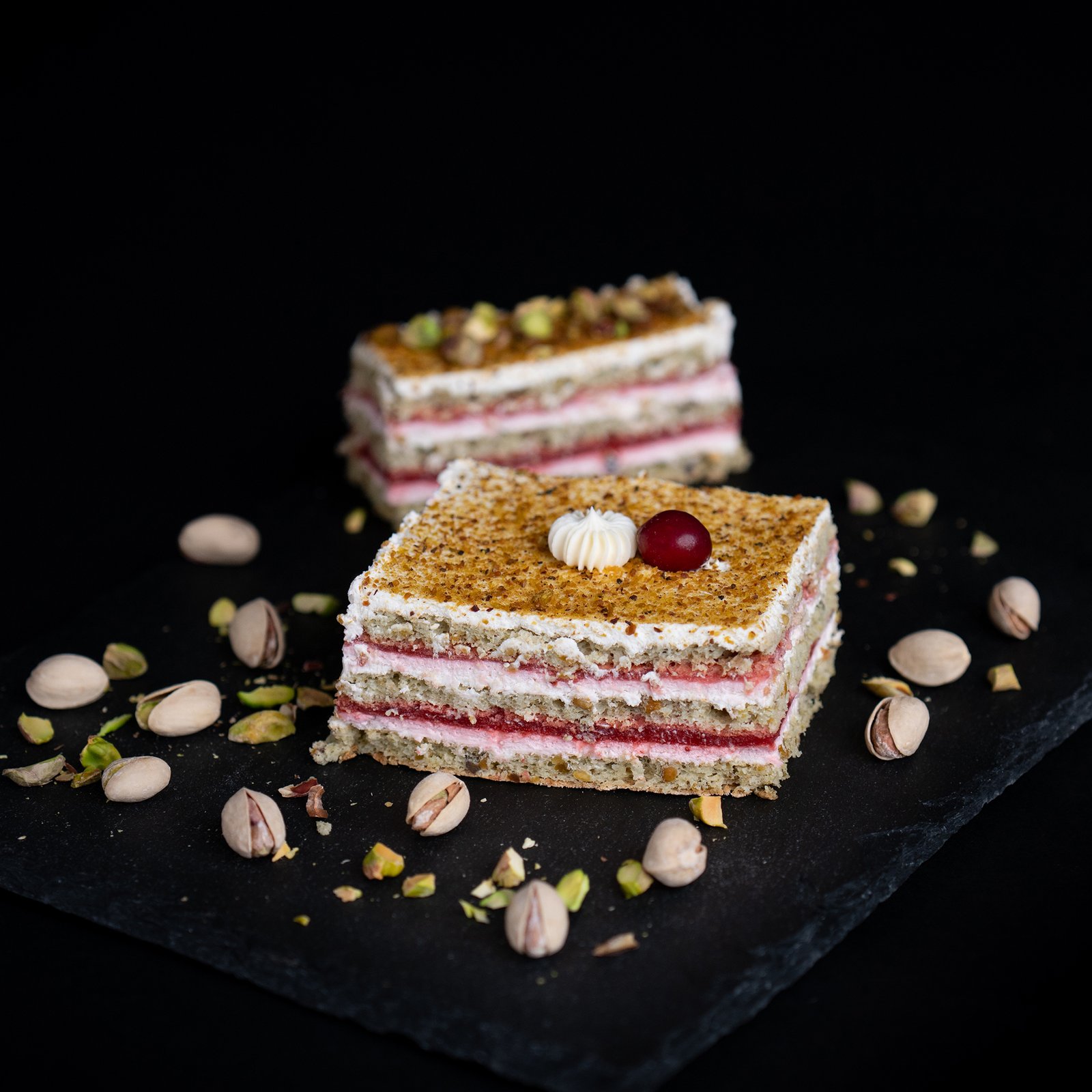 Auksiniai sluoksniai traukia akį švelnia pistacijų žaluma. Paviršius lygus, spindintis, tarsi kviečiantis paragauti. Skonis iš karto atskleidžia natūralų riešutų toną, kurį lydi šiluma ir saldumas. Kiekvienas kąsnis palieka ramų, išlaikytą įspūdį – tarsi mažą akimirką elegancijos.